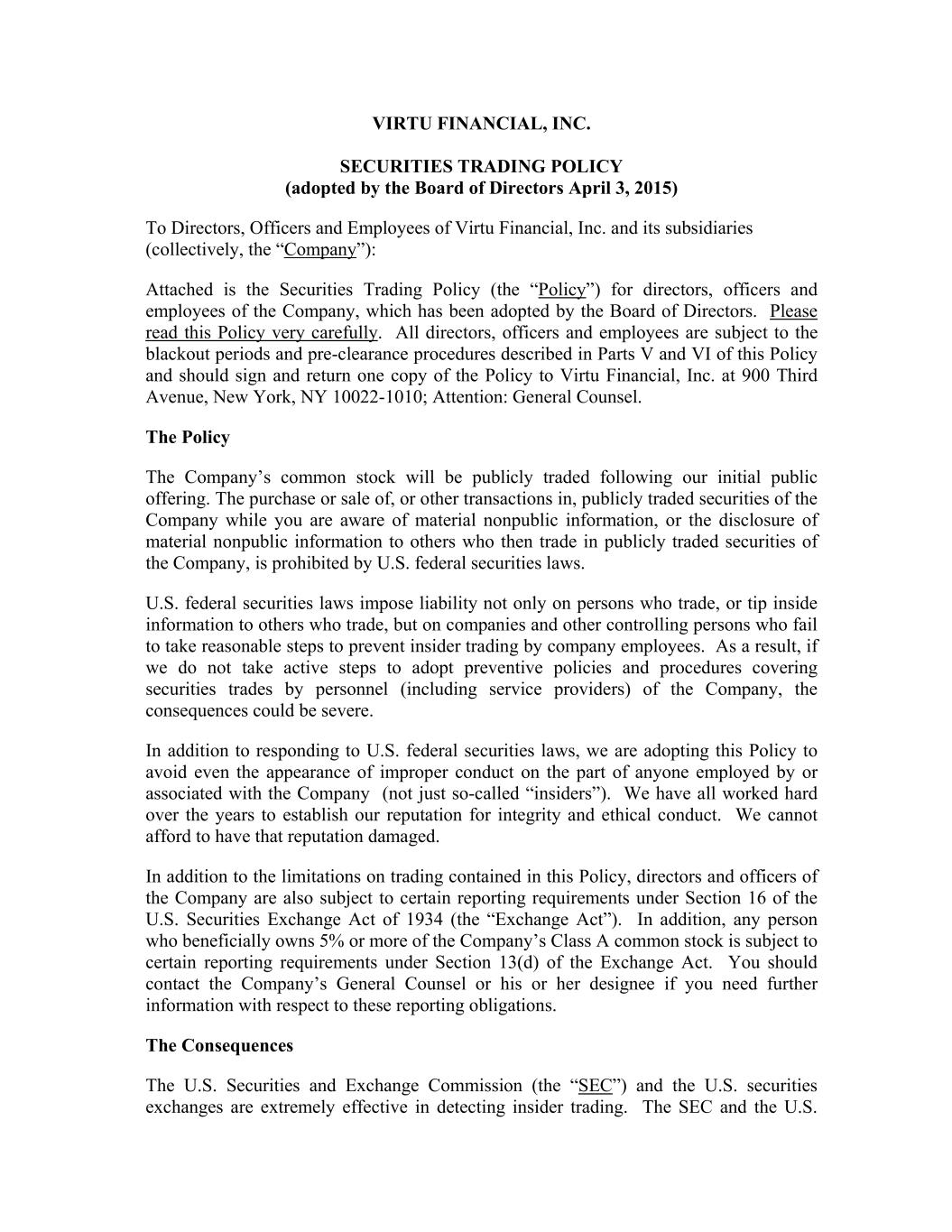VIRTU FINANCIAL, INC. SECURITIES TRADING POLICY (adopted by the Board of Directors April 3, 2015) To Directors, Officers and Employees of Virtu Financial, Inc. and its subsidiaries (collectively, the “Company”): Attached is the Securities Trading Policy (the “Policy”) for directors, officers and employees of the Company, which has been adopted by the Board of Directors. Please read this Policy very carefully. All directors, officers and employees are subject to the blackout periods and pre-clearance procedures described in Parts V and VI of this Policy and should sign and return one copy of the Policy to Virtu Financial, Inc. at 900 Third Avenue, New York, NY 10022-1010; Attention: General Counsel. The Policy The Company’s common stock will be publicly traded following our initial public offering. The purchase or sale of, or other transactions in, publicly traded securities of the Company while you are aware of material nonpublic information, or the disclosure of material nonpublic information to others who then trade in publicly traded securities of the Company, is prohibited by U.S. federal securities laws. U.S. federal securities laws impose liability not only on persons who trade, or tip inside information to others who trade, but on companies and other controlling persons who fail to take reasonable steps to prevent insider trading by company employees. As a result, if we do not take active steps to adopt preventive policies and procedures covering securities trades by personnel (including service providers) of the Company, the consequences could be severe. In addition to responding to U.S. federal securities laws, we are adopting this Policy to avoid even the appearance of improper conduct on the part of anyone employed by or associated with the Company (not just so-called “insiders”). We have all worked hard over the years to establish our reputation for integrity and ethical conduct. We cannot afford to have that reputation damaged. In addition to the limitations on trading contained in this Policy, directors and officers of the Company are also subject to certain reporting requirements under Section 16 of the U.S. Securities Exchange Act of 1934 (the “Exchange Act”). In addition, any person who beneficially owns 5% or more of the Company’s Class A common stock is subject to certain reporting requirements under Section 13(d) of the Exchange Act. You should contact the Company’s General Counsel or his or her designee if you need further information with respect to these reporting obligations. The Consequences The U.S. Securities and Exchange Commission (the “SEC”) and the U.S. securities exchanges are extremely effective in detecting insider trading. The SEC and the U.S.