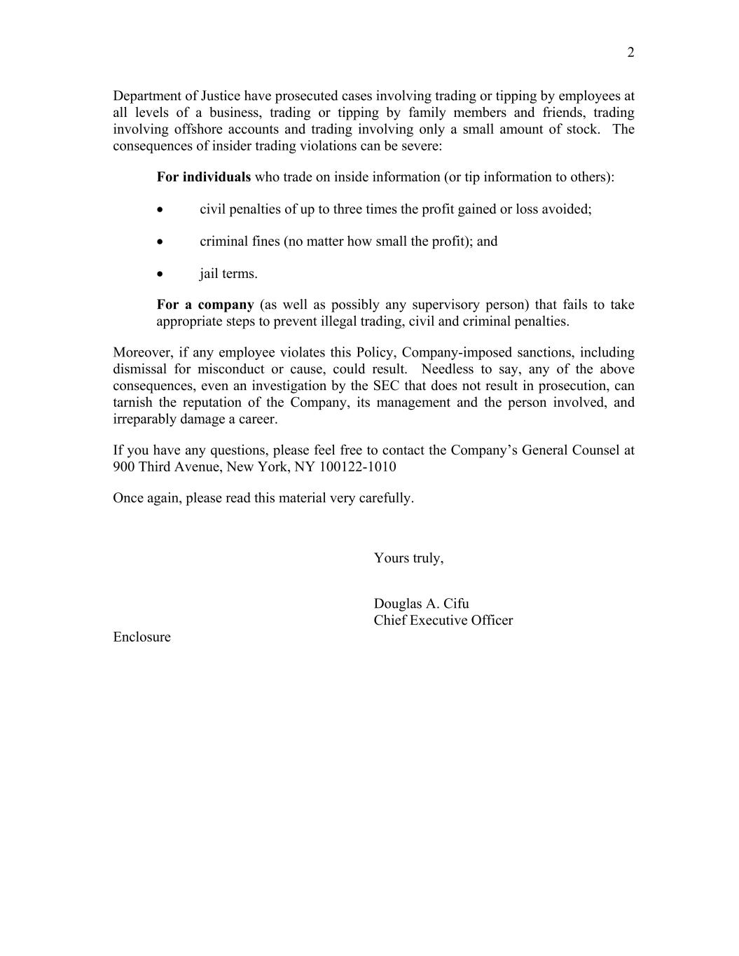 2 Department of Justice have prosecuted cases involving trading or tipping by employees at all levels of a business, trading or tipping by family members and friends, trading involving offshore accounts and trading involving only a small amount of stock. The consequences of insider trading violations can be severe: For individuals who trade on inside information (or tip information to others): civil penalties of up to three times the profit gained or loss avoided; criminal fines (no matter how small the profit); and jail terms. For a company (as well as possibly any supervisory person) that fails to take appropriate steps to prevent illegal trading, civil and criminal penalties. Moreover, if any employee violates this Policy, Company-imposed sanctions, including dismissal for misconduct or cause, could result. Needless to say, any of the above consequences, even an investigation by the SEC that does not result in prosecution, can tarnish the reputation of the Company, its management and the person involved, and irreparably damage a career. If you have any questions, please feel free to contact the Company’s General Counsel at 900 Third Avenue, New York, NY 100122-1010 Once again, please read this material very carefully. Yours truly, Douglas A. Cifu Chief Executive Officer Enclosure