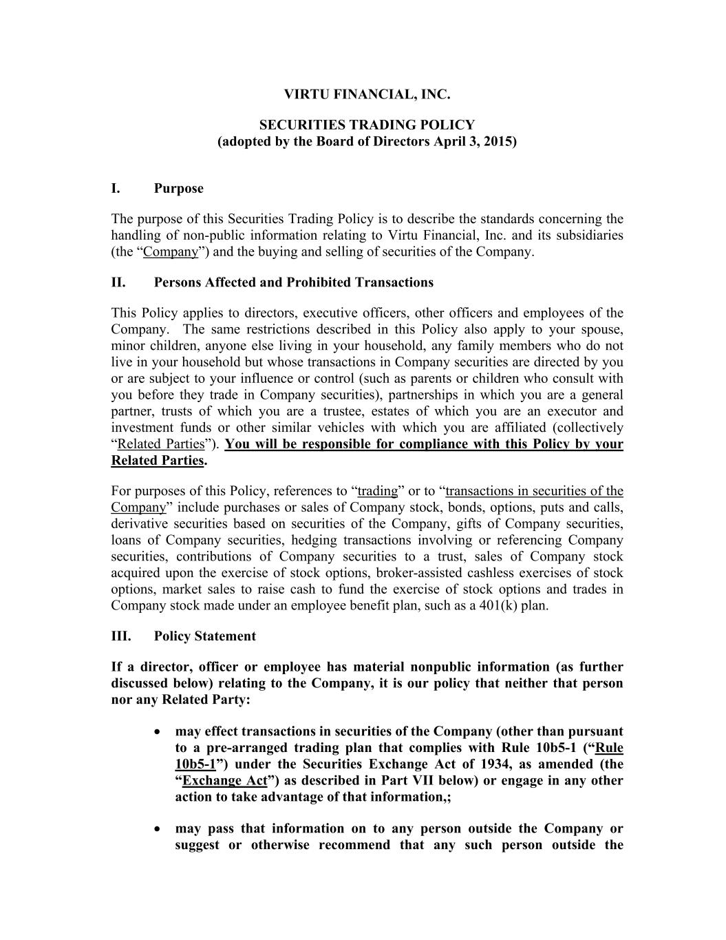 VIRTU FINANCIAL, INC. SECURITIES TRADING POLICY (adopted by the Board of Directors April 3, 2015) I. Purpose The purpose of this Securities Trading Policy is to describe the standards concerning the handling of non-public information relating to Virtu Financial, Inc. and its subsidiaries (the “Company”) and the buying and selling of securities of the Company. II. Persons Affected and Prohibited Transactions This Policy applies to directors, executive officers, other officers and employees of the Company. The same restrictions described in this Policy also apply to your spouse, minor children, anyone else living in your household, any family members who do not live in your household but whose transactions in Company securities are directed by you or are subject to your influence or control (such as parents or children who consult with you before they trade in Company securities), partnerships in which you are a general partner, trusts of which you are a trustee, estates of which you are an executor and investment funds or other similar vehicles with which you are affiliated (collectively “Related Parties”). You will be responsible for compliance with this Policy by your Related Parties. For purposes of this Policy, references to “trading” or to “transactions in securities of the Company” include purchases or sales of Company stock, bonds, options, puts and calls, derivative securities based on securities of the Company, gifts of Company securities, loans of Company securities, hedging transactions involving or referencing Company securities, contributions of Company securities to a trust, sales of Company stock acquired upon the exercise of stock options, broker-assisted cashless exercises of stock options, market sales to raise cash to fund the exercise of stock options and trades in Company stock made under an employee benefit plan, such as a 401(k) plan. III. Policy Statement If a director, officer or employee has material nonpublic information (as further discussed below) relating to the Company, it is our policy that neither that person nor any Related Party: may effect transactions in securities of the Company (other than pursuant to a pre-arranged trading plan that complies with Rule 10b5-1 (“Rule 10b5-1”) under the Securities Exchange Act of 1934, as amended (the “Exchange Act”) as described in Part VII below) or engage in any other action to take advantage of that information,; may pass that information on to any person outside the Company or suggest or otherwise recommend that any such person outside the