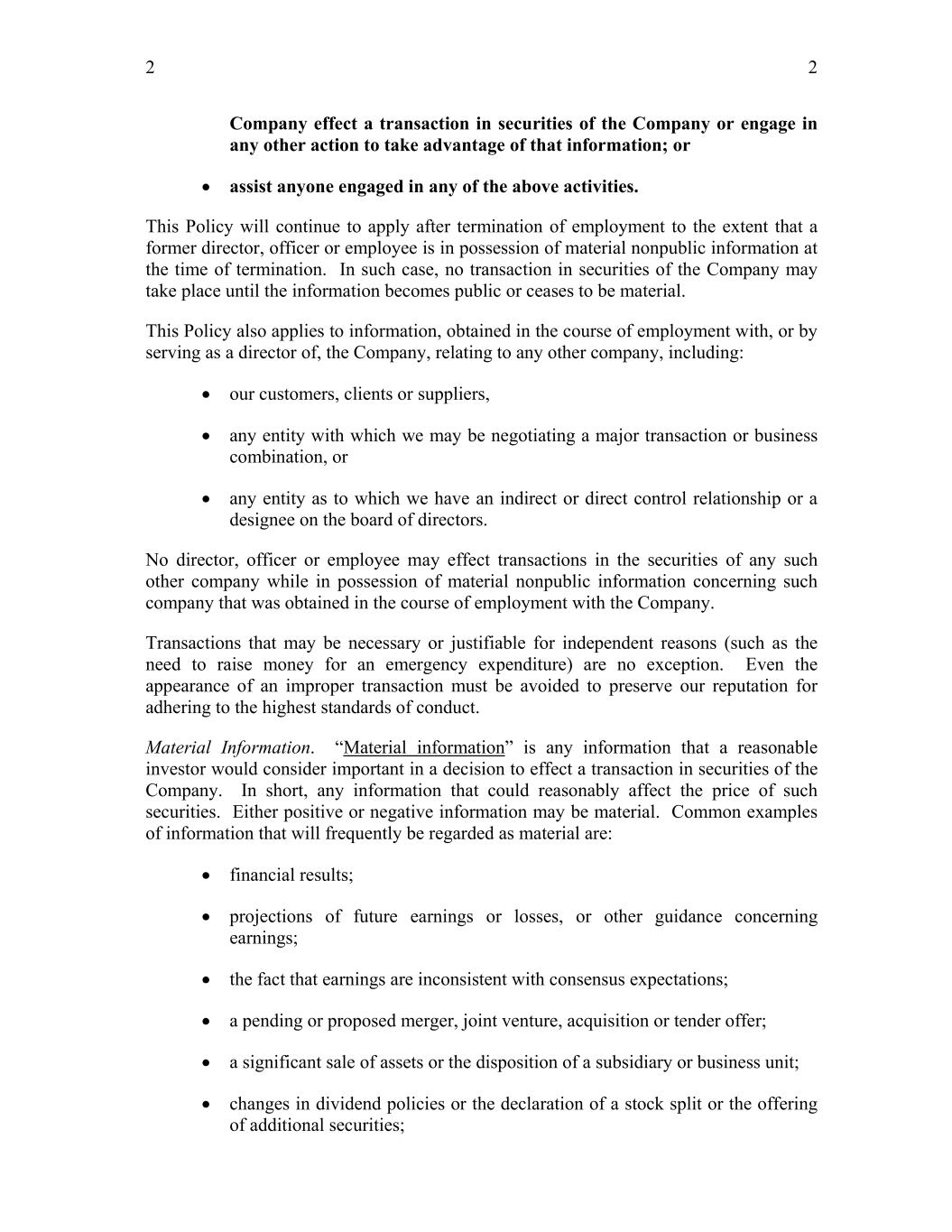 2 2 Company effect a transaction in securities of the Company or engage in any other action to take advantage of that information; or assist anyone engaged in any of the above activities. This Policy will continue to apply after termination of employment to the extent that a former director, officer or employee is in possession of material nonpublic information at the time of termination. In such case, no transaction in securities of the Company may take place until the information becomes public or ceases to be material. This Policy also applies to information, obtained in the course of employment with, or by serving as a director of, the Company, relating to any other company, including: our customers, clients or suppliers, any entity with which we may be negotiating a major transaction or business combination, or any entity as to which we have an indirect or direct control relationship or a designee on the board of directors. No director, officer or employee may effect transactions in the securities of any such other company while in possession of material nonpublic information concerning such company that was obtained in the course of employment with the Company. Transactions that may be necessary or justifiable for independent reasons (such as the need to raise money for an emergency expenditure) are no exception. Even the appearance of an improper transaction must be avoided to preserve our reputation for adhering to the highest standards of conduct. Material Information. “Material information” is any information that a reasonable investor would consider important in a decision to effect a transaction in securities of the Company. In short, any information that could reasonably affect the price of such securities. Either positive or negative information may be material. Common examples of information that will frequently be regarded as material are: financial results; projections of future earnings or losses, or other guidance concerning earnings; the fact that earnings are inconsistent with consensus expectations; a pending or proposed merger, joint venture, acquisition or tender offer; a significant sale of assets or the disposition of a subsidiary or business unit; changes in dividend policies or the declaration of a stock split or the offering of additional securities;