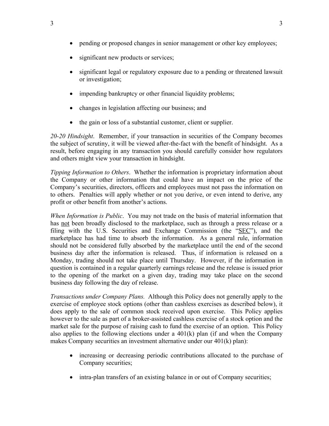 3 3 pending or proposed changes in senior management or other key employees; significant new products or services; significant legal or regulatory exposure due to a pending or threatened lawsuit or investigation; impending bankruptcy or other financial liquidity problems; changes in legislation affecting our business; and the gain or loss of a substantial customer, client or supplier. 20-20 Hindsight. Remember, if your transaction in securities of the Company becomes the subject of scrutiny, it will be viewed after-the-fact with the benefit of hindsight. As a result, before engaging in any transaction you should carefully consider how regulators and others might view your transaction in hindsight. Tipping Information to Others. Whether the information is proprietary information about the Company or other information that could have an impact on the price of the Company’s securities, directors, officers and employees must not pass the information on to others. Penalties will apply whether or not you derive, or even intend to derive, any profit or other benefit from another’s actions. When Information is Public. You may not trade on the basis of material information that has not been broadly disclosed to the marketplace, such as through a press release or a filing with the U.S. Securities and Exchange Commission (the “SEC”), and the marketplace has had time to absorb the information. As a general rule, information should not be considered fully absorbed by the marketplace until the end of the second business day after the information is released. Thus, if information is released on a Monday, trading should not take place until Thursday. However, if the information in question is contained in a regular quarterly earnings release and the release is issued prior to the opening of the market on a given day, trading may take place on the second business day following the day of release. Transactions under Company Plans. Although this Policy does not generally apply to the exercise of employee stock options (other than cashless exercises as described below), it does apply to the sale of common stock received upon exercise. This Policy applies however to the sale as part of a broker-assisted cashless exercise of a stock option and the market sale for the purpose of raising cash to fund the exercise of an option. This Policy also applies to the following elections under a 401(k) plan (if and when the Company makes Company securities an investment alternative under our 401(k) plan): increasing or decreasing periodic contributions allocated to the purchase of Company securities; intra-plan transfers of an existing balance in or out of Company securities;
