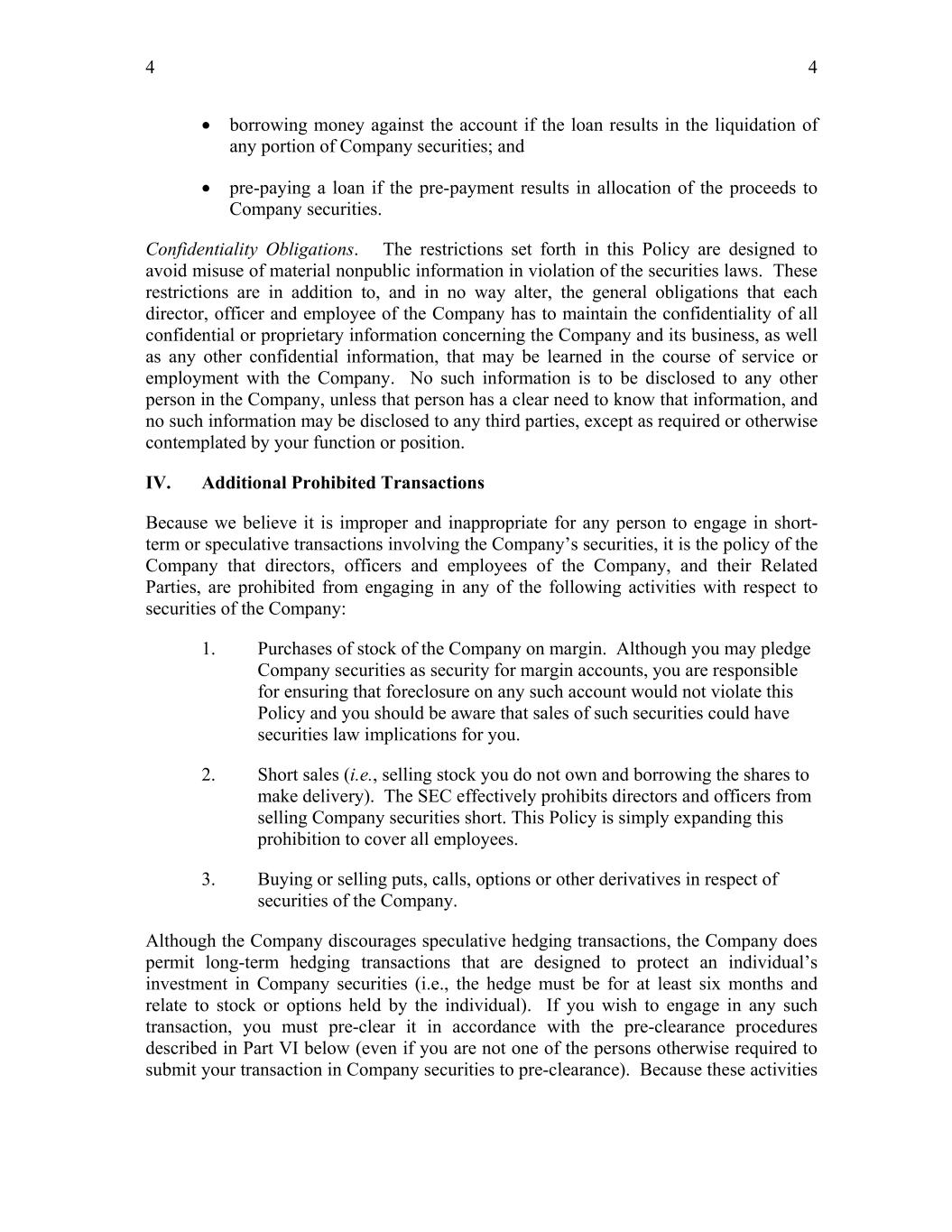 4 4 borrowing money against the account if the loan results in the liquidation of any portion of Company securities; and pre-paying a loan if the pre-payment results in allocation of the proceeds to Company securities. Confidentiality Obligations. The restrictions set forth in this Policy are designed to avoid misuse of material nonpublic information in violation of the securities laws. These restrictions are in addition to, and in no way alter, the general obligations that each director, officer and employee of the Company has to maintain the confidentiality of all confidential or proprietary information concerning the Company and its business, as well as any other confidential information, that may be learned in the course of service or employment with the Company. No such information is to be disclosed to any other person in the Company, unless that person has a clear need to know that information, and no such information may be disclosed to any third parties, except as required or otherwise contemplated by your function or position. IV. Additional Prohibited Transactions Because we believe it is improper and inappropriate for any person to engage in short- term or speculative transactions involving the Company’s securities, it is the policy of the Company that directors, officers and employees of the Company, and their Related Parties, are prohibited from engaging in any of the following activities with respect to securities of the Company: 1. Purchases of stock of the Company on margin. Although you may pledge Company securities as security for margin accounts, you are responsible for ensuring that foreclosure on any such account would not violate this Policy and you should be aware that sales of such securities could have securities law implications for you. 2. Short sales (i.e., selling stock you do not own and borrowing the shares to make delivery). The SEC effectively prohibits directors and officers from selling Company securities short. This Policy is simply expanding this prohibition to cover all employees. 3. Buying or selling puts, calls, options or other derivatives in respect of securities of the Company. Although the Company discourages speculative hedging transactions, the Company does permit long-term hedging transactions that are designed to protect an individual’s investment in Company securities (i.e., the hedge must be for at least six months and relate to stock or options held by the individual). If you wish to engage in any such transaction, you must pre-clear it in accordance with the pre-clearance procedures described in Part VI below (even if you are not one of the persons otherwise required to submit your transaction in Company securities to pre-clearance). Because these activities