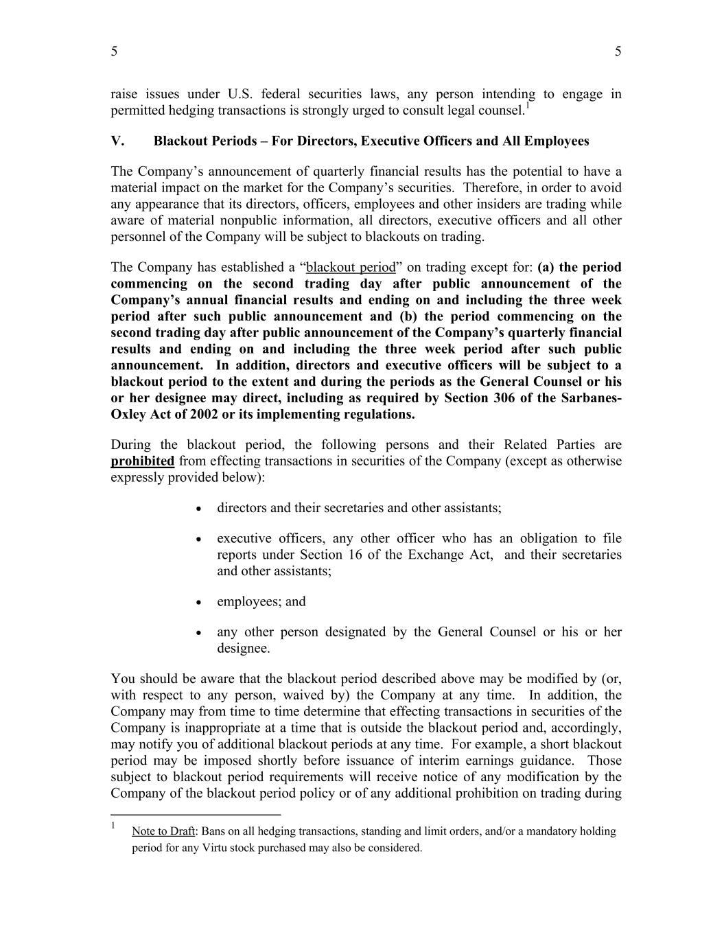 5 5 raise issues under U.S. federal securities laws, any person intending to engage in permitted hedging transactions is strongly urged to consult legal counsel.1 V. Blackout Periods – For Directors, Executive Officers and All Employees The Company’s announcement of quarterly financial results has the potential to have a material impact on the market for the Company’s securities. Therefore, in order to avoid any appearance that its directors, officers, employees and other insiders are trading while aware of material nonpublic information, all directors, executive officers and all other personnel of the Company will be subject to blackouts on trading. The Company has established a “blackout period” on trading except for: (a) the period commencing on the second trading day after public announcement of the Company’s annual financial results and ending on and including the three week period after such public announcement and (b) the period commencing on the second trading day after public announcement of the Company’s quarterly financial results and ending on and including the three week period after such public announcement. In addition, directors and executive officers will be subject to a blackout period to the extent and during the periods as the General Counsel or his or her designee may direct, including as required by Section 306 of the Sarbanes- Oxley Act of 2002 or its implementing regulations. During the blackout period, the following persons and their Related Parties are prohibited from effecting transactions in securities of the Company (except as otherwise expressly provided below): directors and their secretaries and other assistants; executive officers, any other officer who has an obligation to file reports under Section 16 of the Exchange Act, and their secretaries and other assistants; employees; and any other person designated by the General Counsel or his or her designee. You should be aware that the blackout period described above may be modified by (or, with respect to any person, waived by) the Company at any time. In addition, the Company may from time to time determine that effecting transactions in securities of the Company is inappropriate at a time that is outside the blackout period and, accordingly, may notify you of additional blackout periods at any time. For example, a short blackout period may be imposed shortly before issuance of interim earnings guidance. Those subject to blackout period requirements will receive notice of any modification by the Company of the blackout period policy or of any additional prohibition on trading during 1 Note to Draft: Bans on all hedging transactions, standing and limit orders, and/or a mandatory holding period for any Virtu stock purchased may also be considered.