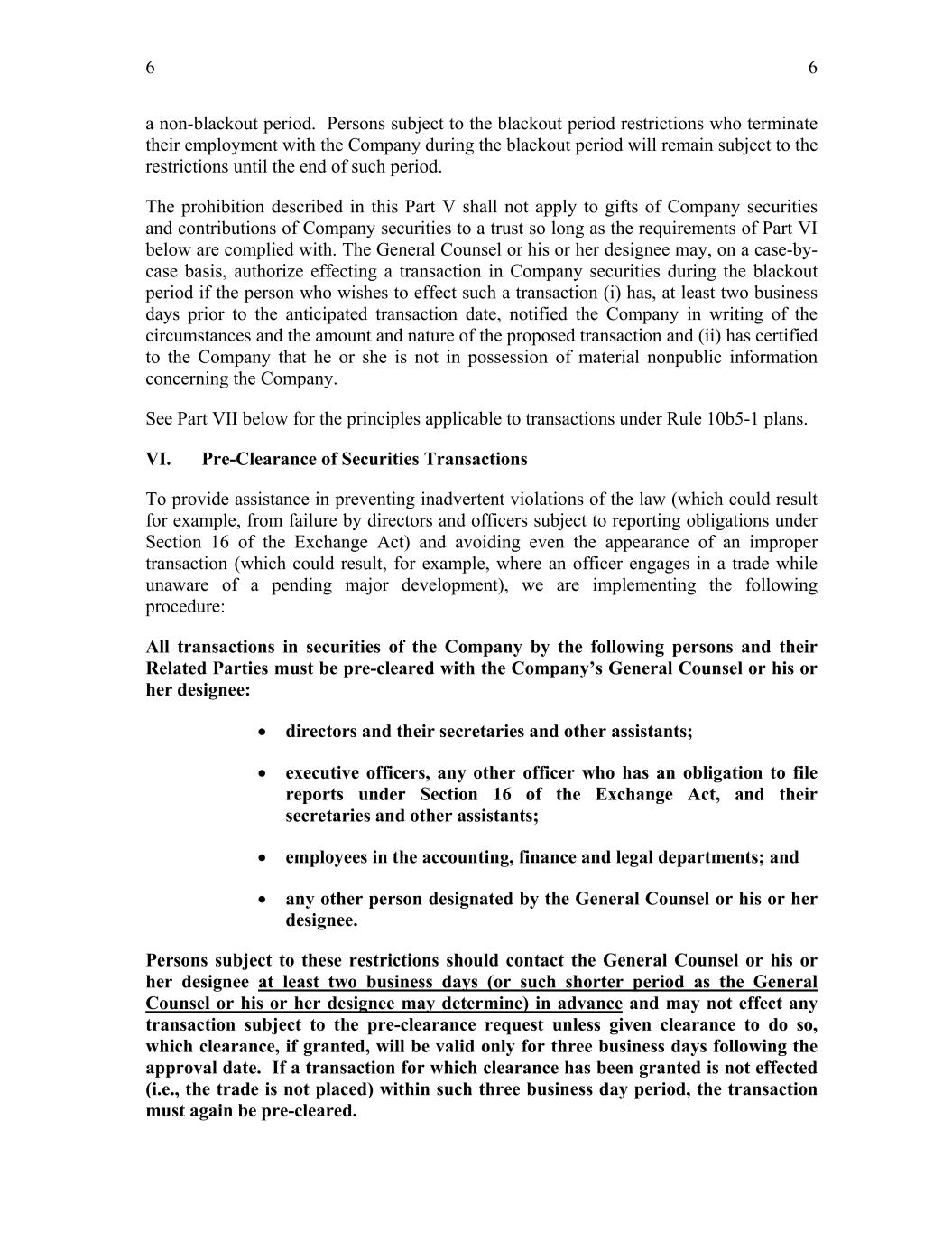 6 6 a non-blackout period. Persons subject to the blackout period restrictions who terminate their employment with the Company during the blackout period will remain subject to the restrictions until the end of such period. The prohibition described in this Part V shall not apply to gifts of Company securities and contributions of Company securities to a trust so long as the requirements of Part VI below are complied with. The General Counsel or his or her designee may, on a case-by- case basis, authorize effecting a transaction in Company securities during the blackout period if the person who wishes to effect such a transaction (i) has, at least two business days prior to the anticipated transaction date, notified the Company in writing of the circumstances and the amount and nature of the proposed transaction and (ii) has certified to the Company that he or she is not in possession of material nonpublic information concerning the Company. See Part VII below for the principles applicable to transactions under Rule 10b5-1 plans. VI. Pre-Clearance of Securities Transactions To provide assistance in preventing inadvertent violations of the law (which could result for example, from failure by directors and officers subject to reporting obligations under Section 16 of the Exchange Act) and avoiding even the appearance of an improper transaction (which could result, for example, where an officer engages in a trade while unaware of a pending major development), we are implementing the following procedure: All transactions in securities of the Company by the following persons and their Related Parties must be pre-cleared with the Company’s General Counsel or his or her designee: directors and their secretaries and other assistants; executive officers, any other officer who has an obligation to file reports under Section 16 of the Exchange Act, and their secretaries and other assistants; employees in the accounting, finance and legal departments; and any other person designated by the General Counsel or his or her designee. Persons subject to these restrictions should contact the General Counsel or his or her designee at least two business days (or such shorter period as the General Counsel or his or her designee may determine) in advance and may not effect any transaction subject to the pre-clearance request unless given clearance to do so, which clearance, if granted, will be valid only for three business days following the approval date. If a transaction for which clearance has been granted is not effected (i.e., the trade is not placed) within such three business day period, the transaction must again be pre-cleared.