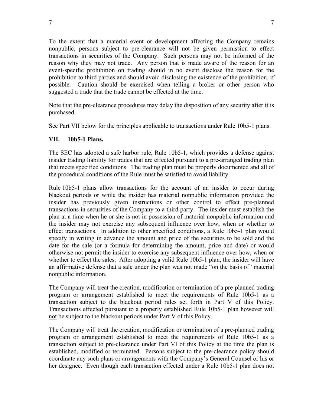 7 7 To the extent that a material event or development affecting the Company remains nonpublic, persons subject to pre-clearance will not be given permission to effect transactions in securities of the Company. Such persons may not be informed of the reason why they may not trade. Any person that is made aware of the reason for an event-specific prohibition on trading should in no event disclose the reason for the prohibition to third parties and should avoid disclosing the existence of the prohibition, if possible. Caution should be exercised when telling a broker or other person who suggested a trade that the trade cannot be effected at the time. Note that the pre-clearance procedures may delay the disposition of any security after it is purchased. See Part VII below for the principles applicable to transactions under Rule 10b5-1 plans. VII. 10b5-1 Plans. The SEC has adopted a safe harbor rule, Rule 10b5-1, which provides a defense against insider trading liability for trades that are effected pursuant to a pre-arranged trading plan that meets specified conditions. The trading plan must be properly documented and all of the procedural conditions of the Rule must be satisfied to avoid liability. Rule 10b5-1 plans allow transactions for the account of an insider to occur during blackout periods or while the insider has material nonpublic information provided the insider has previously given instructions or other control to effect pre-planned transactions in securities of the Company to a third party. The insider must establish the plan at a time when he or she is not in possession of material nonpublic information and the insider may not exercise any subsequent influence over how, when or whether to effect transactions. In addition to other specified conditions, a Rule 10b5-1 plan would specify in writing in advance the amount and price of the securities to be sold and the date for the sale (or a formula for determining the amount, price and date) or would otherwise not permit the insider to exercise any subsequent influence over how, when or whether to effect the sales. After adopting a valid Rule 10b5-1 plan, the insider will have an affirmative defense that a sale under the plan was not made “on the basis of” material nonpublic information. The Company will treat the creation, modification or termination of a pre-planned trading program or arrangement established to meet the requirements of Rule 10b5-1 as a transaction subject to the blackout period rules set forth in Part V of this Policy. Transactions effected pursuant to a properly established Rule 10b5-1 plan however will not be subject to the blackout periods under Part V of this Policy. The Company will treat the creation, modification or termination of a pre-planned trading program or arrangement established to meet the requirements of Rule 10b5-1 as a transaction subject to pre-clearance under Part VI of this Policy at the time the plan is established, modified or terminated. Persons subject to the pre-clearance policy should coordinate any such plans or arrangements with the Company’s General Counsel or his or her designee. Even though each transaction effected under a Rule 10b5-1 plan does not