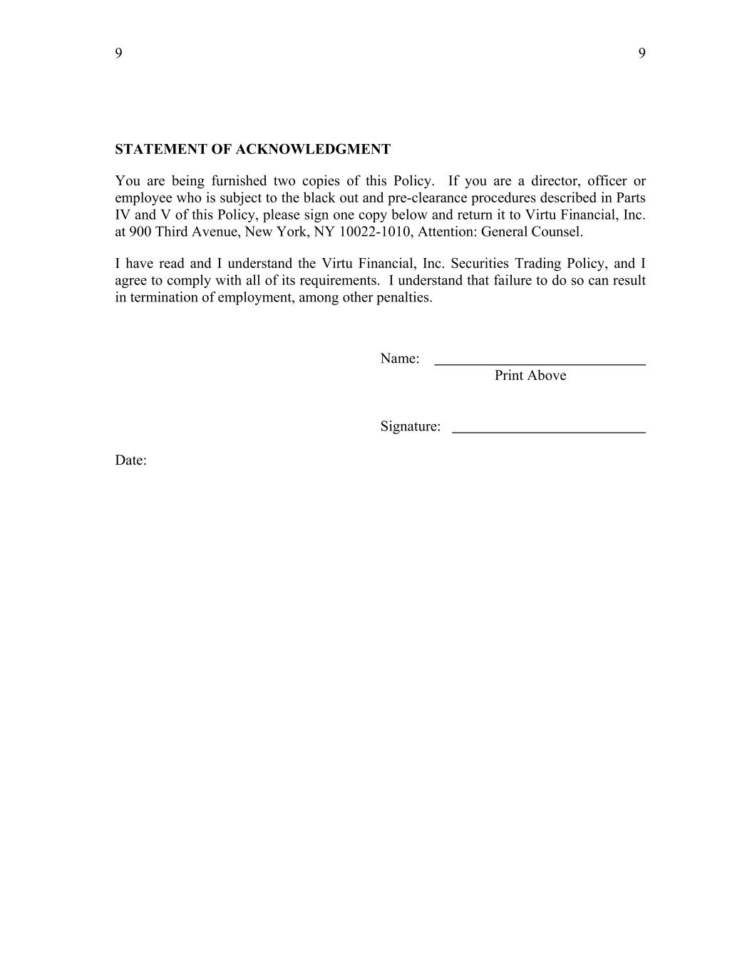 9 9 STATEMENT OF ACKNOWLEDGMENT You are being furnished two copies of this Policy. If you are a director, officer or employee who is subject to the black out and pre-clearance procedures described in Parts IV and V of this Policy, please sign one copy below and return it to Virtu Financial, Inc. at 900 Third Avenue, New York, NY 10022-1010, Attention: General Counsel. I have read and I understand the Virtu Financial, Inc. Securities Trading Policy, and I agree to comply with all of its requirements. I understand that failure to do so can result in termination of employment, among other penalties. Name: Print Above Signature: Date: